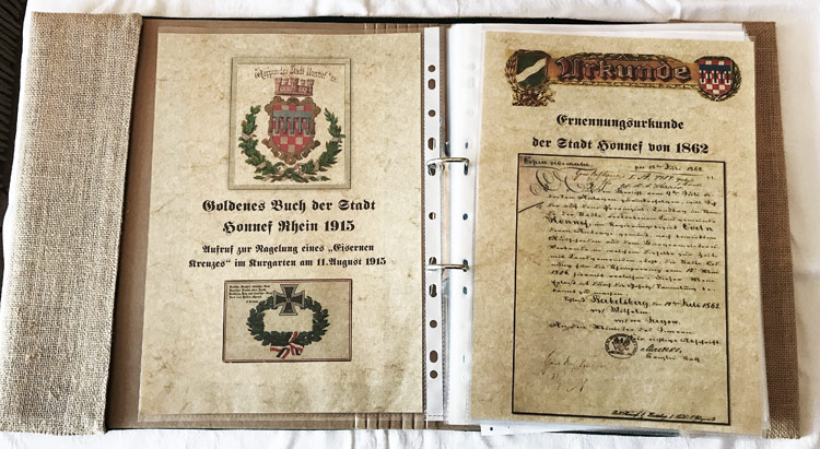 Schatz aus dem Jahr 1912 Honnefer Heimatforscher rekonstruiert „Goldenes Buch" ...sogenannten Kriegsnagelungen aus dem ersten Weltkrieg: Gegen eine Spende, offiziell zugunsten der Kriegsopfer, wurden damals in zahlreichen deutschen Städten Nägel in Holzfiguren geschlagen. Auch in Bad Honnef soll es eine solche Kriegsnagelung gegeben haben. Den Spendern winkte ein Eintrag in ein extra dafür aufgelegtes „Goldenes Buch“. Weder die Nagelung noch das Buch sind heute noch erhalten. In aufwendigen Recherchearbeiten hat der Honnefer Heimatforscher Martin Maus das „Goldene Buch“ von 1915 aber rekonstruiert.