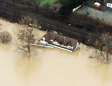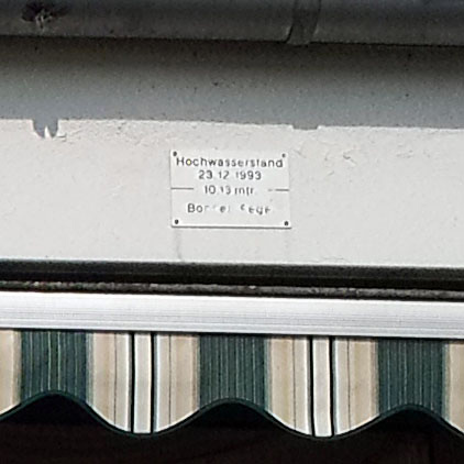 Beim 3. Bild (vergrößert) befindet sich über dem rechten Restaurantfenster eine Außenmarkierung vom Hochwasser 1993. Sie zeigt den bisherigen Höchststand von 10,13 m, da war er 7 cm höher als 1995.