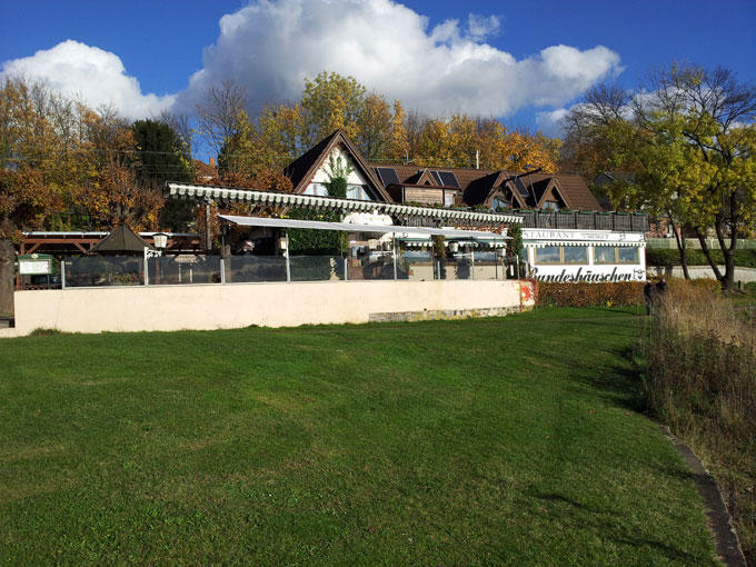 Beim 2. Bild erkennt man deutlicher, das der Standort des "Bundeshäuschen" hier sehr beengt ist. Es liegt zwischen Bundesbahndamm und unmittelbar am Rhein. Zwischen Bahndamm und Restaurant verläuft lediglich ein Radweg, und im Vordergrund verläuft am Biergarten und Außenterasse der Wanderweg Bonn/Bad Honnef.