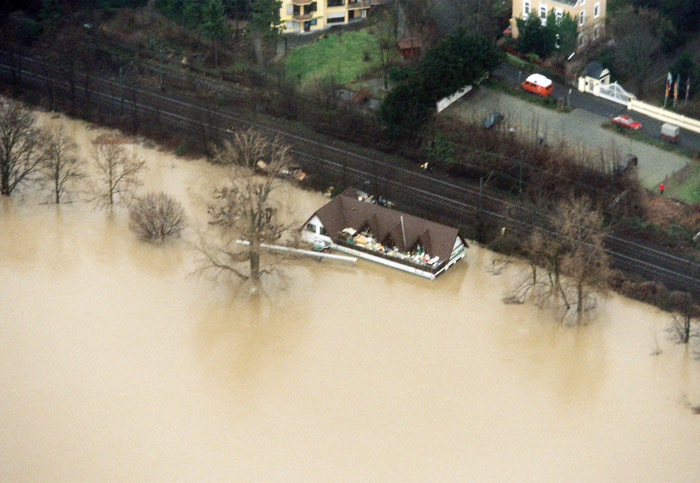 Das Luftbild zeigt das "Restaurant Bundeshäuschen" im rechtsrheinischen Bonn-Oberkassel, Oberkasseler Ufer 4. 1995 hatte der Rhein ein Hochwasser mit katastrophalen Wasserständen, die am Bonner Pegel am 30.01.1995 ein Höchststand von 10,06 erreichte. Nur 1993 war der Wasserstand noch höher, und der Pegel zeigte in Bonn den Höchststand von 10,13 an.