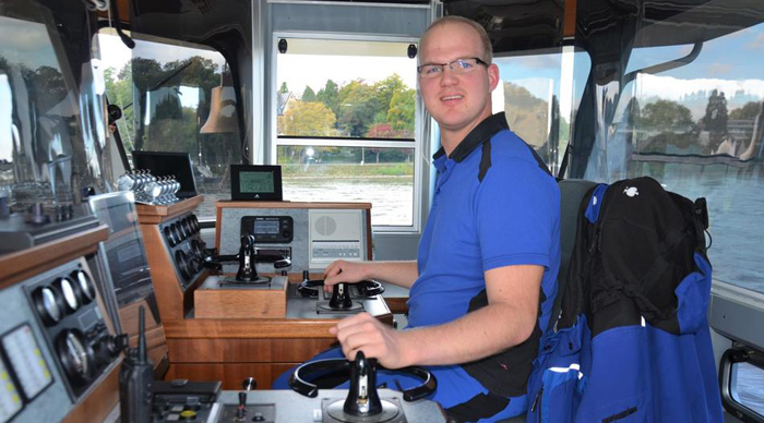Foto: Der 28-jährige Stefan Zinke steuert die Rheinfähre Konrad Adenauer zwischen Oberdollendorf und Bad Godesberg hin und her.