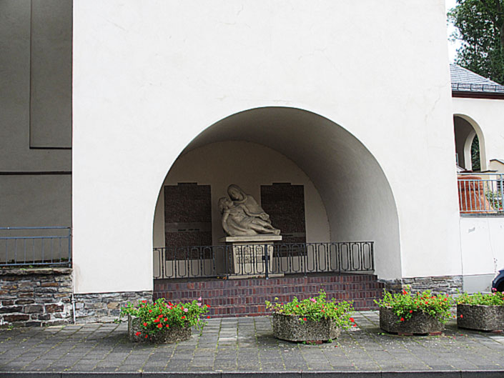 29.07.1953 Oberdollendorf. Das neue Kriegerehrenmal an der Pfarrkirche wird am kommenden Sonntag, 2. August, eingeweiht. Im Innenraum der Ehrenmalnische wird die vom Bildhauer Wessling-Rhöndorf geschaffene Pieta-Figur aufgestellt. Ringsum werden die Namen der Gefallenen und Vermißten verzeichnet. Die Einweihungsfeier wird durch die beiden Oberdollendorfer Bruderschaften gestaltet. Bürgermeister Tendler hält die Festansprache, Pfarrer Hühnerbein nimmt die Einsegnung vor.