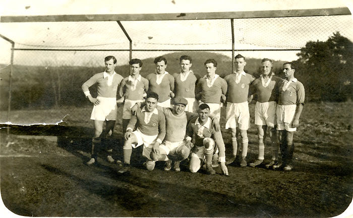 Als in den 30er Jahren des vorigen Jahrhunderts in Oberdollendorf vom Turn- und Sportverein u.a. eine Feldhandballmannschaft aufgestellt wurde, diente diese Wiese als Vereinssportplatz. Der in West/Ost Richtung angelegte Sportplatz erhielt die offizielle Bezeichnung "Spielwiese". Die erste Mannschaft des Hanballvereins soll dem Vernehmen nach recht erfolgreich gewesen sein. Auf dem gezeigten Foto hat die 1. Handballmannschaft im östlichen Tor Aufstellung genommen. Als Orientierungshilfe dient hier der Bildhintergrund, auf dem die Kuppe des Weilbergs zu erkennen ist. Leider bereitet es zur Zeit erhebliche Schwierigkeiten, die Namen der gezeigten Spieler zu ermitteln. Kennen Sie vielleicht noch jemanden??? |