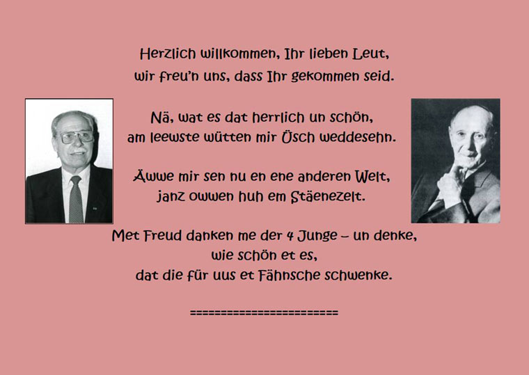 [Der Assenmachers Jean und der Schneiders Franz-Josef, die zwei, die Zeit ihres Lebens den Leuten viel Freude gemacht haben, gucken ganz von oben und freuen sich, dass hier mit einem schönen Abend an sie gedacht wird.]