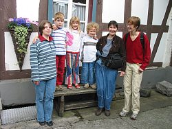 „Wunderbar, was Sie geleistet haben, Sie können stolz drauf sein!“ schrieb die Ortsbürgermeisterin von Buchholz/ Westerwald, Margret Wallau (4.v.l.), in unser Gästebuch. Am Samstag, 16. Juli 2005, hatte Sie mit einigen Ratsmitgliedern und Herren vom Westerwald-Verein Buchholz e.V. unser Museum besucht. Der Westerwaldverein hatte den Besuch empfohlen, weil ihnen das Museumskonzept, das wir für unser ehrenamtlich geführtes Haus entwickelt haben, bei einem Termin im Mai gefallen hatte. Ähnliches könnte nun in Buchholz entstehen. Von Oberdollendorf ging es weiter nach Niederbreitbach.