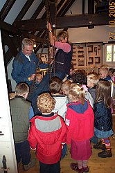 Die vielseitige Führung durch das Brückenhofmuseum war für die Schüler der Longenburgschule Niederdollendorf am Freitagnachmittag, 18. November 2005, eine spannende Sache. Ein Teil der Betreuungsgruppe war im Rahmen der Offenen Ganztagsschule mit ihren Betreuerinnen Paula Langer und Uschi Wittern in die Bachstraße gekommen. Eine Gaudi war es, Frau Wittern mit dem Flaschenzug nach oben zu ziehen. Lothar Vreden freute sich, dass er Kinder aus seiner ehemaligen Grundschule, an der er fast 30 Jahre Schulleiter war, begrüßen konnte.