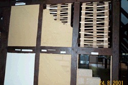 Beim Ausbau des Dachgeschosses 1999 wurden einige Gefache im Haus durch die Werkstätte für Denkmalpflege Jürgen Theis mit Materialien der Firma Claytec zu Demonstrationszwecken in unterschiedlicher Weise hergerichtet: So können Sie erkennen, wie man früher die Gefache mit Weidenruten, Eichenstaken und einem Gemisch aus Lehm und Gerstenstroh hergerichtet und dann zum Beispiel mit Hilfe von Schweineborsten verputzt hat. Den Besitzern von Fachwerkhäusern zeigen wir zudem eine Möglichkeit, wie man heute die Gefache mit Steinen aus Lehm und Stroh reparieren oder restaurieren kann.