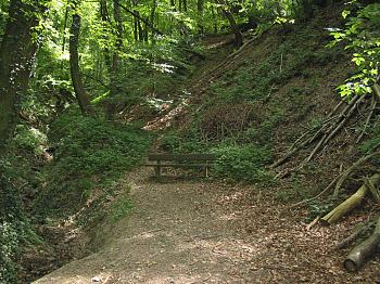 10 m oberhalb der Bank war der Stolleneingang, der rechts in den Berghang führte; links davon ist nach 60 Jahren noch die Abraumhalde zu erkennen; ganz links das Bett des Schleifenbachs.