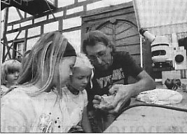 Das Museum hatte hierzu Olaf Dülfer und Georg Neumann von der Universität Bonn zu Gast, die Einblicke in die Erforschung von Lebewesen vergangener Erdperioden gaben. Dülfer bearbeitete vor dem Haus Steinplatten mit den zahnarztähnlichen Druckluftsticheln, mit denen er vorsichtig in die Steine eingeschlossene Fossilien freilegen kann. Unterdessen erläuterte Georg Neumann die Sonderausstellung von Fossilien, Gesteinen und Mineralien im ersten Obergeschoss. Dabei zeigte er nicht nur seine Lieblingsstücke wie die fossilen Überreste von Krokodilen und das gut erhaltene Kugelgelenk eines Nashorns, die beide in Hennef-Rott gefunden worden sind.