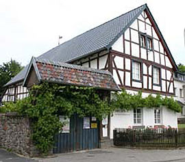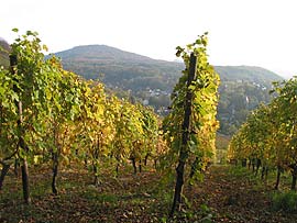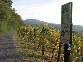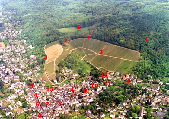 Auf dem Bild des Luftbildfotografen Knut Laubner sehen Sie, wie wunderbar sich die Oberdollendorfer Weinberge am Rande des Ortskerns an die Dollendorfer Hardt (246 m ü.N.N.) anschmiegen. Legende: 1 Rheinsteig, 2 Aussichtspunkt Hülle mit Schutzhütte „Rheinblick“ und Steinkreis, 3 Weinwanderweg, 4 Zuweg zum Rheinsteig, 5 Brückenhofmuseum, 6 Weinhaus Weinmühle, 7 Bauernschenke, 8 Weinhaus Lichtenberg, 9 Bungertshof, 10 Pension Ley, 11 Pfarrkirche St. Laurentius, 12 Weinhaus Lichtenberg, 13 Weingut Blöser Foto: Laubner-Luftbild, Bonn u. Berlin